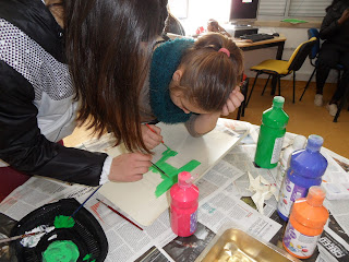 Perante tanto trabalho dos alunos do 6ºano, alguns colegas da turma V91, que estavam na biblioteca a aguardar que os computadores tivessem sinal de internet para darem continuidade ao trabalho que estavam a fazer, ofereceram-se para ajudar na pintura.