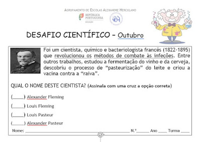 No passado ano letivo tivemos mensalmente, na biblioteca, o Desafio Matemático para os alunos tentarem responder. Este ano vamos ter o Desafio Científico promovido pela docente Fernanda Amélia. Convidamos os alunos a passarem pela biblioteca e tentarem responder ao Desafio Científico do mês de outubro. No final do mês, divulgaremos os vencedores.